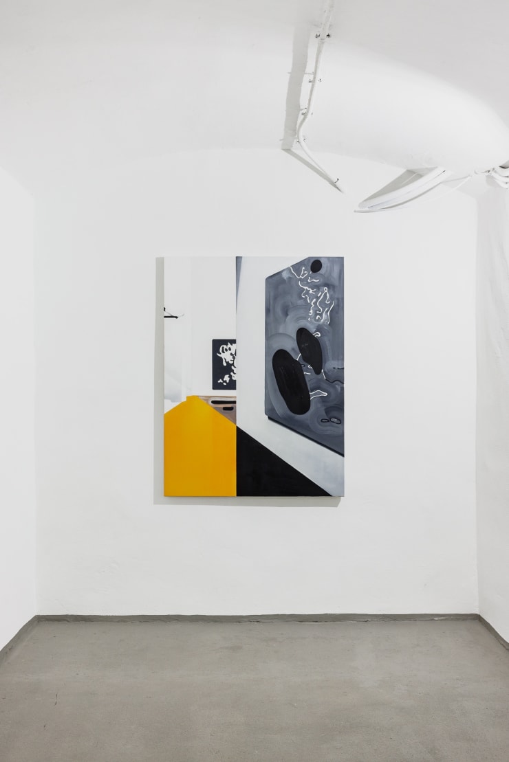 and how close they could be. The metamorphosis of humankind is illustrated in the photographs presented by Tina Lechner. By cutting, curving, banding and gluing she builds up science fiction figures or armors for protection of humanity or human inner-sides. Markus Huemer paints inner-spaces which resemble exploded interiors and which create the experience of unsuccessfully created virtual reality where the walls overpass each other, the staircase handles and cables are flying spectral in the space. Just a hint of the brushstroke on the sides brings back to the substance of painting.