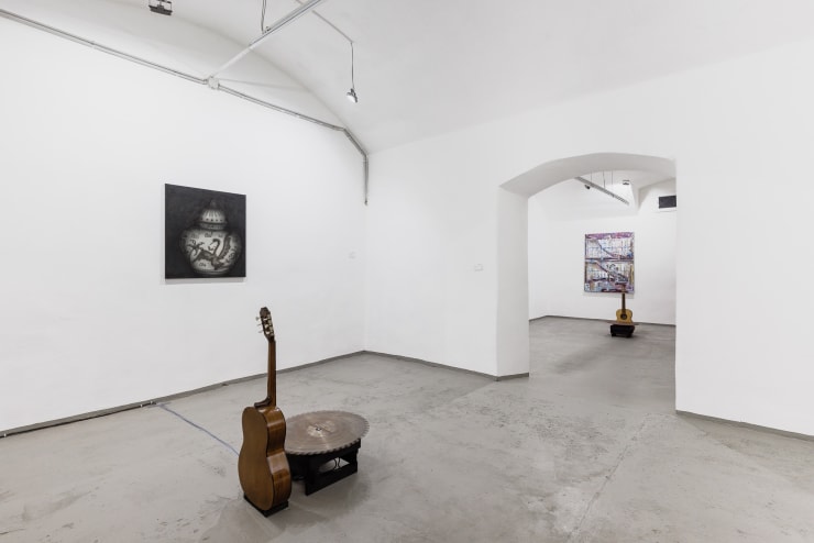 distance in the exhibition is suggested to be identified both as a physical distance seen or felt through the art works and also as a metaphor disclosing art works in their individual manifestation. The viewer is invited to cross over the invisible and unapproachable and rather dive into what is possible to everyone - the imaginative here or there – the distances that you can reach, the places that you can be in. The looping sound coming from the sound installation “Sägezahm” created by Andreas Trobollowitsch influences the expansion of our vision. Two/ three guitars, whose strings are delicately touched by turning metal discs settled on a set of turn tables, create a melancholic polyphony and carry off the audience into the atmosphere of unequal distances. The sound spreads with repetitive circles through the space, echoing on each art