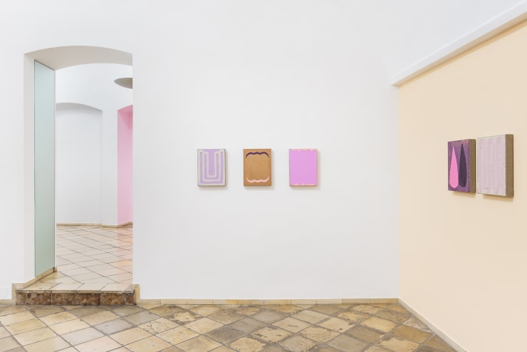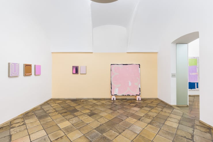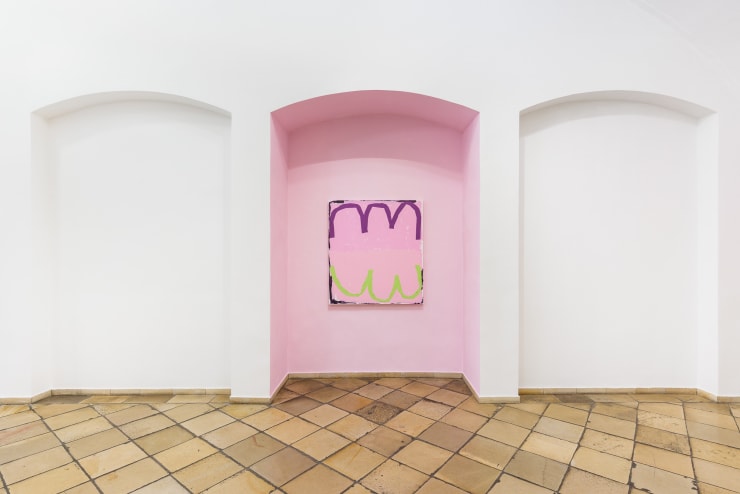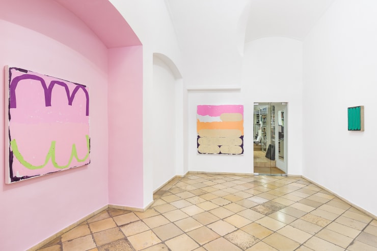 Julia Brennacher Werke entstehen immer geschlossen für ein Ausstellungsprojekt. Auch wenn die Künstlerin die Werke als Einheit entstehen lässt, funktioniert jede Arbeit für sich alleine eigenständig, eben wie auch ein Spieler mit seiner Mannschaft am Spielfeld individuell agiert. Für die Galerie Suppan und die darin zu findenden hohen Raumnischen, sind beispielsweise speziell Hochformate entstanden, die zusätzlich auf bemalten Podesten stehen und die gestaffelte Raumarchitektur der Galerie aufnehmen. Die bemalten Podeste greifen zudem die Objektbeziehung der Minimal Art auf und erweitern als Farbkörper die Malerei um ein dreidimensionales Element. In ihren einfachen, dem Geometrischen angenäherten Formen erinnern diese Objekte an bunte Klötze oder Bausteine und greifen den Aspekt des Spiels wiederum auf.