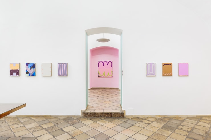 Wenn sich die Definition von Abstraktion bei der Künstlerin mit dem Spielfeld übersetzt, versteht sie darin auch die Aneignung und Adaption unterschiedlicher, aber vor allem historischer Malereipraxen. So zeigt sie sich ebenso fasziniert von der Verwendung der oft pastos aufgebrachten Ölfarbe wie auch dem sehr unmittelbaren Auftragen von Sprayfarben. Oder der Verwendung eines groben Leinwandgewebes bei den Kleinformaten, die eine Auto-Poetik zwischen dem eigendynamischen Verhalten des verwebten Leinens und dem Farbauftrag der Künstlerin impliziert. Der Abstraktionsbegriff bei Julia Brennacher ist ein kunstgeschichtliches Referenzsystem, das verschiedene Anwendungs- und Übersetzungstechniken der Malerei dekliniert. Das beinhaltet Wassily Kandinsys Vorstellung zu Synästhesie zwischen Abstraktionsraum und Farbklängen genauso wie die formal konzeptionelle Auffassung des amerikanischen Künstlers Christopher Wool, der in seiner Malereiauffassung mehr auf die Werkzeuge (wie z.B. Pinsel, Schablonen oder Walzen), mit denen er das Bild entstehen lässt, fokussiert, denn auf das, was er damit malt. Was wieder an den pragmatischen und formfindenden Einsatz des oben beschriebenen Pinselstrichs der Künstlerin erinnert. Das zeigt auch eine Nähe zu Martin Creeds konzeptionellen „Step Paintings“ auf, der im Kleinformat mit genormten Haushaltspinseln einzelne, cremig bunte Farbschichten tortengleich aufeinandertürmt,um daraus eine gewisse Fröhlichkeit für sich zu behaupten. Auch wenn Brennacher sich selbst nicht so stark der konzeptionellen Strenge von Martin Creed vergleichbar sieht, ergänzen sich doch seine Farbigkeit, Formfindung und seine ambivalente Heiterkeit mit ihrem Ansatz. Die Künstlerin kondensiert ihre künstlerische Praxis aus dem Farbspektrum der uns vorliegenden Gegenwartskultur, die in einem beständigen Sinne den designten Oberflächen verschiedener digitaler Medienkanälen oder Instagram Filtern folgen und eben keine ästhetische Gefälligkeit sind. „Diese Farbigkeit“, so sagt die Künstlerin, „in der immer wieder stark artifizielle Töne wie auch softe Pastelle auftauchen, kann auch als subjektive Übersetzung unserer Gegenwart gelesen werden, in der heute vieles durchgestylt erscheint und Einflüsse aus Pop, Mode und Design wie auch unserer Konsumkultur anklingen.“